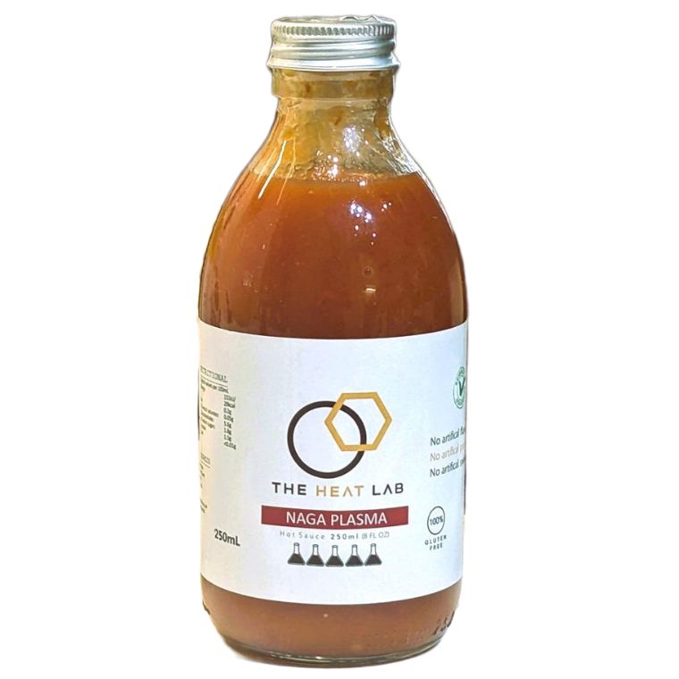 Naga Chilli peppers, Scotch bonnets, Garlic, Onion, White wine vinegar, Xantham Gum.
