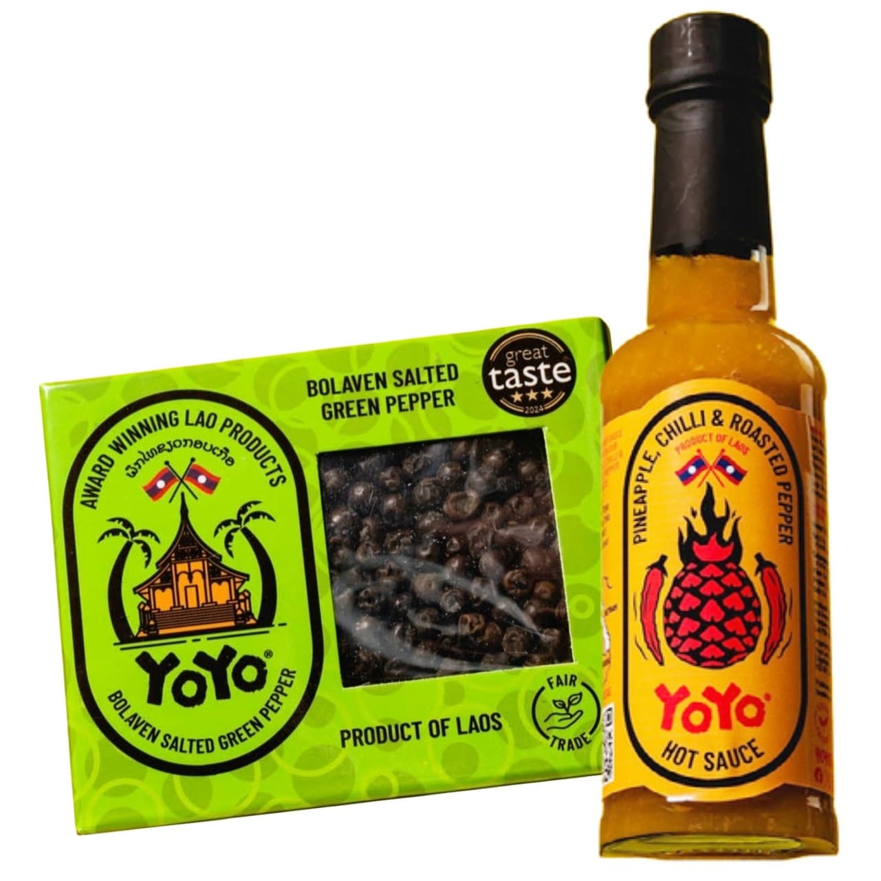 Award-winning flavour, straight from Laos via Yorkshire. This vibrant duo brings together two of our most celebrated products, the YoYo Pineapple, Chilli & Roasted Pepper Sauce, crowned Best Condiment in Yorkshire at the 2025 Taste Awards, and the YoYo Bolaven Salted Green PepperHighly Commended in the Best Pantry Product in Yorkshire category, adding to its prestigious 3-Star Great Taste Award 2024.
